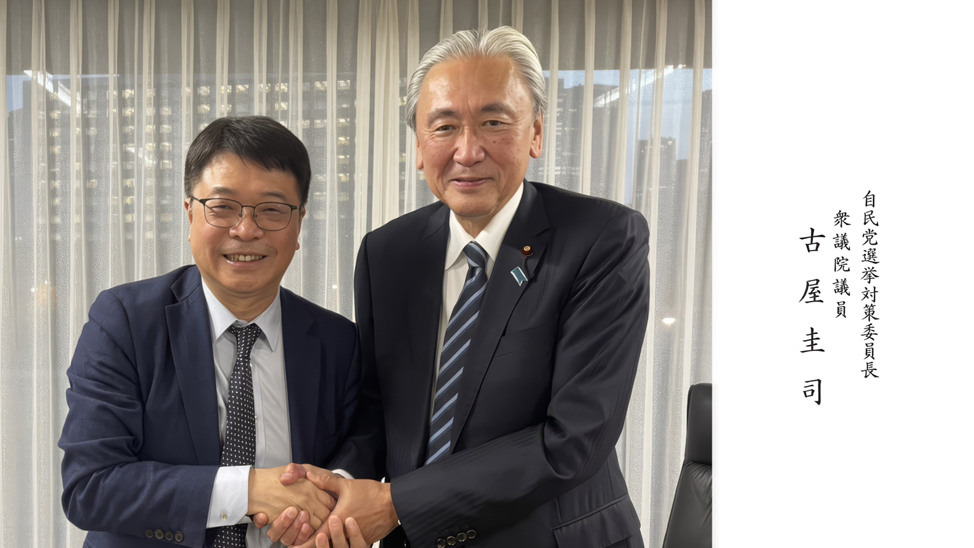 (左)熊本株式会社取締役會長陳振興、(右)自民黨選舉對策委員長、眾議院議員古屋圭司,兩位的2025年12月01日會談後最後合影留念。